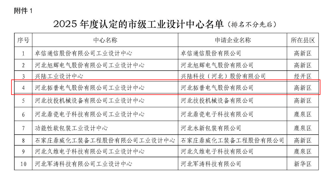 喜報!河北拓普電氣榮獲“石家莊市級工業(yè)設(shè)計中心”稱號